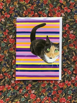 Stripes of colour stand front and centre throughout my work. As a maximalist, I adore colour and pattern. Stripes are a joyous and engaging way to inject colour, but in the case of my cat series, they also serve to make the cat portraits all the more personal, with the background shades being carefully selected to reflect each cat’s personality and character traits.